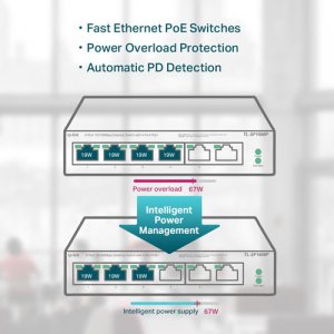 – TL-SF1006P Supports PoE Power up to 67 W for all PoE ports.