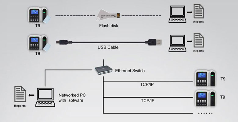 T9 có thể kết nối với máy tính để lấy dữ liệu qua 2 hình thức chính